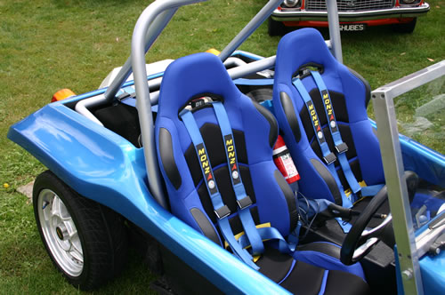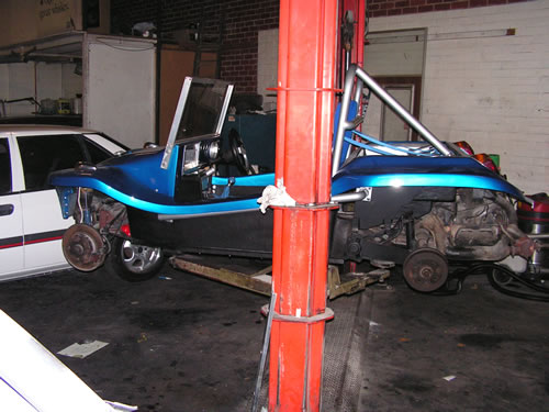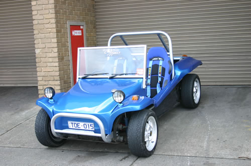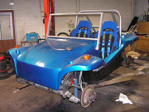 When that was all painted the body went back onto the floor pan, then that went onto the hoist were she sat for about six to eight months, when I did all the finishing things - like reassemble the front end and change it to disc brakes, fully rewiring everything, fitting "bug eye" headlights, fuel tank, bonnet, windscreen etc. Then it was time to make an interior of some description: four point harnesses and wrap around bucket seats would be the main eye sore, I chose silver for all the bar work - being the roll cage, sidebars and font and rear bars. All other areas were I couldn't decide what colour they ended up black. Cutting in the dash was a bit hairy; I wasn't sure what to do so I thought I'd make it up my own way. I found some nice looking gauges at Autobarn and in they went along with a fully sick monster tacho, the usual stuff also.