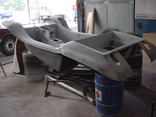 I got this new toy down to my Dad's panel shop (that's gonna help a heap) and started cleaning and disassembling. Shortly she was down to a rolling floor pan and a fibreglass body which I'd removed for prep and paint. It didn't take long to get the rolling floor pan a driving floor pan, which I must admit is really weird to drive in the car park at the work shop. The body, well I rubbed it back and primed it, then rubbed it again and at this stage I still didn't know what colour to paint it. I've always liked blue so blue it was going to be. Blue-print that should look good I thought; so blue-print here we come!